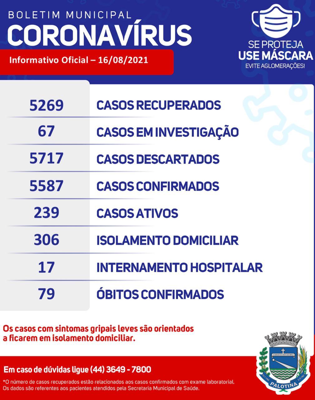 O boletim informativo desta segunda-feira (16), divulgado pela Secretaria Municipal de Saúde de Palotina, aponta que 26 novos casos de Covid-19 foram confirmados no município, 29 pacientes se recuperaram nas últimas 24 horas, 17 pessoas estão internadas e o número de casos ativos somam 239.