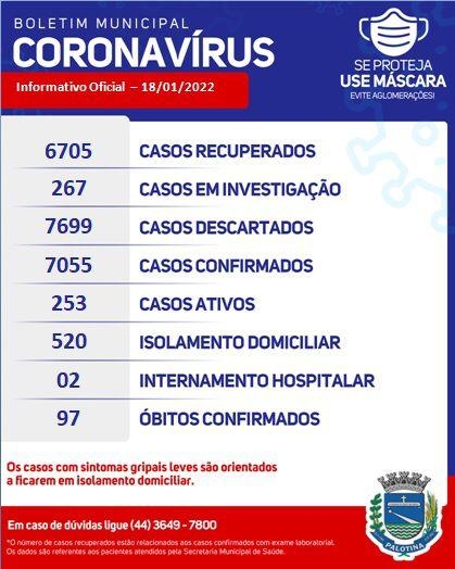 O boletim informativo desta terça-feira (18/01), divulgado pela Secretaria Municipal de Saúde de Palotina aponta que nas últimas 24 horas, 32 novos casos de Covid-19 foram confirmados no Município, 13 pacientes se recuperaram, 2 palotinenses encontram-se internados e o número de casos ativos somam 253.