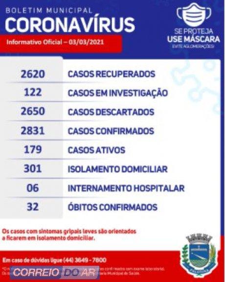 Evite a transmissão do Covid-19. o município teve 32 óbitos desde o início da pandemia, 301 pacientes estão em isolamento domiciliar acompanhado pela Secretaria de Saúde.