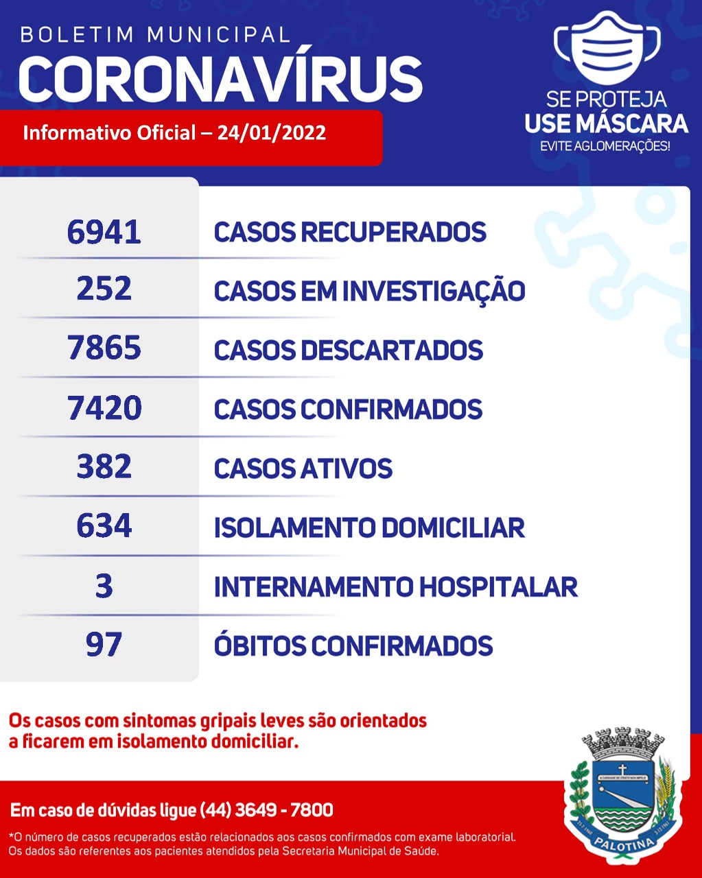 O boletim informativo desta segunda-feira (24), divulgado pela Secretaria Municipal de Saúde de Palotina aponta que nas últimas 24 horas, 60 novos casos de Covid-19 foram confirmados no Município, 100 pacientes se recuperaram, 3 palotinenses estão internados e o número de casos ativos somam 382.