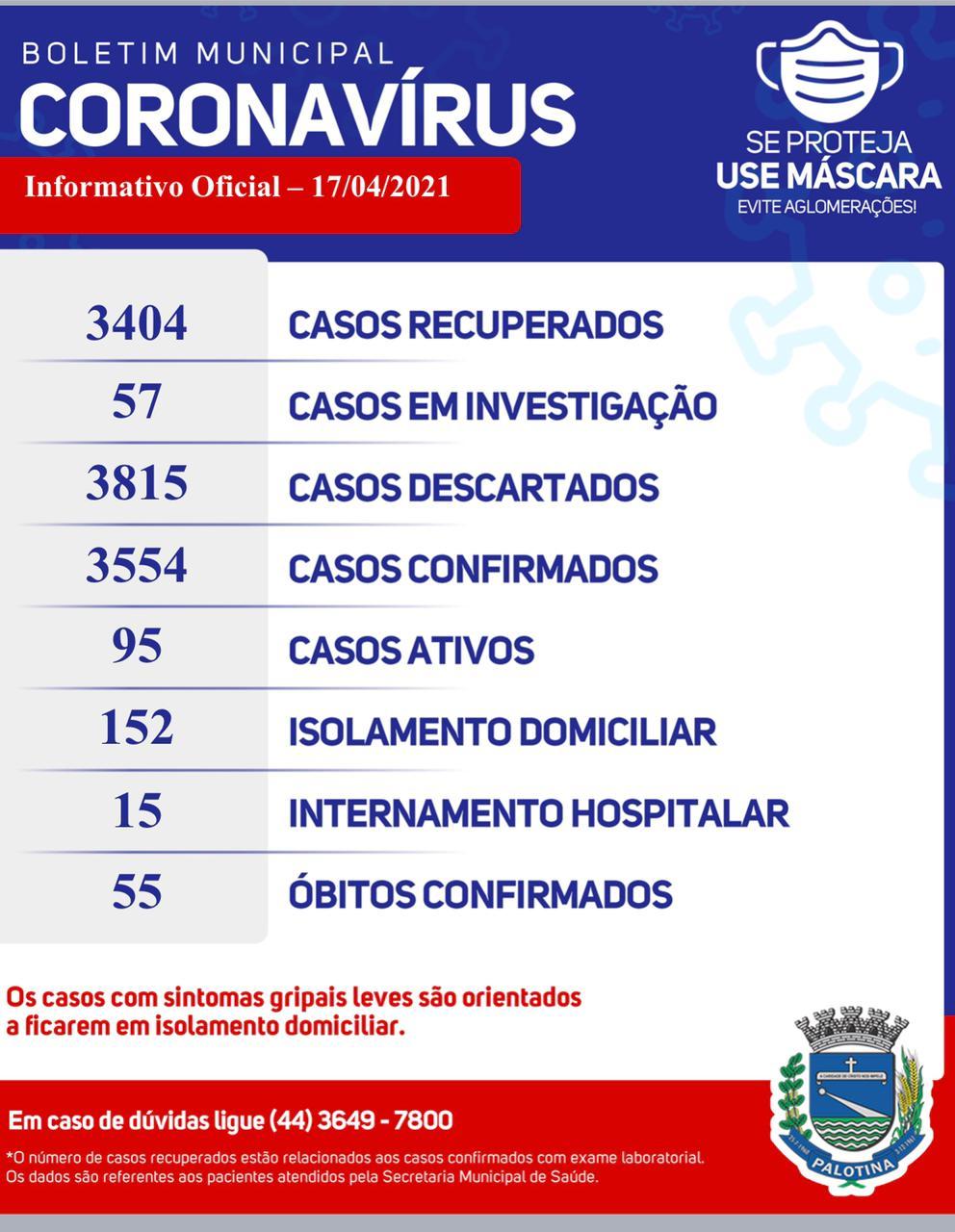 O boletim informativo deste sábado (17), divulgado pela Secretaria Municipal de Saúde de Palotina, aponta que 16 novos casos de Covid-19 foram confirmados no município, 8 pacientes se recuperaram nas últimas 24 horas, 15 pessoas estão internadas e o número de casos ativos somam 95.