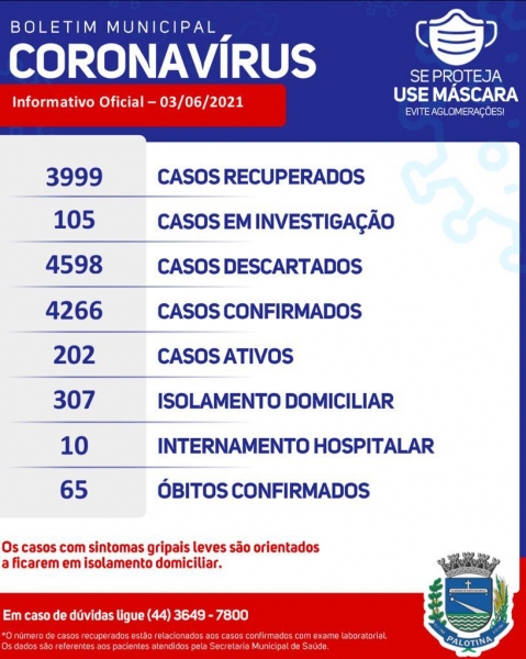O boletim informativo desta quinta-feira (03/06), divulgado pela Secretaria Municipal de Saúde de Palotina, aponta que 36 novos casos de Covid-19 foram confirmados no município, 7 pacientes se recuperaram nas últimas 24 horas, 10 pessoas estão internadas e o número de casos ativos somam 202.