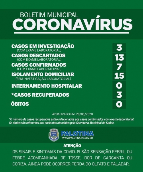A secretaria municipal de Saúde de Palotina atualizou na tarde desta quarta-feira (20), o boletim sobre o Coronavírs no município.