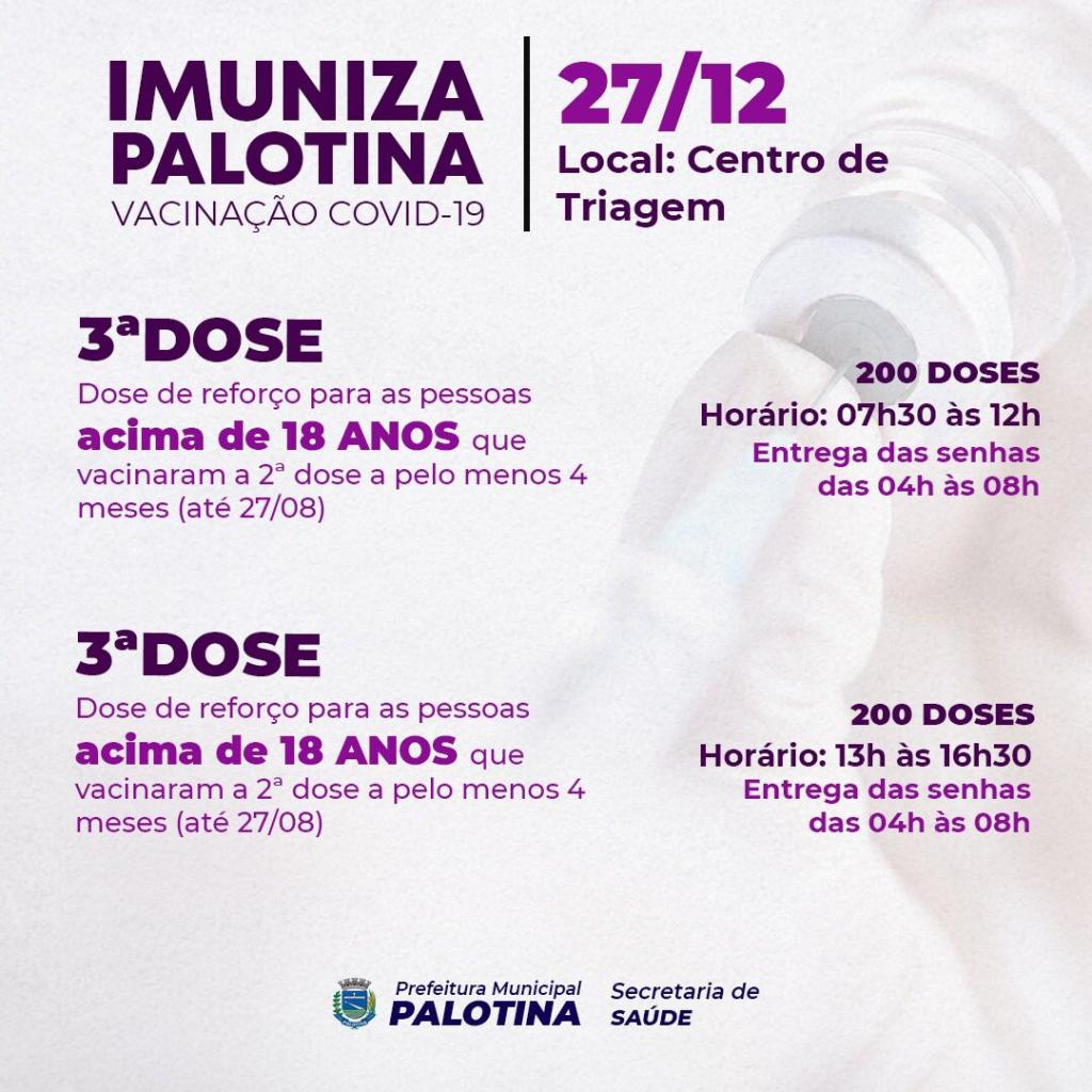 A direção da Secretaria Municipal de Saúde de Palotina informa que nesta segunda-feira, dia 27 de dezembro, a equipe de vacinação vai aplicar somente a dose de reforço (3ª dose), da vacina contra a covid-19. Os palotinenses a partir dos 18 anos de idade que receberem a segunda dose até o dia 27 de agosto de 2021, devem procurar o local de vacinação para receber a terceira dose do imunizante.