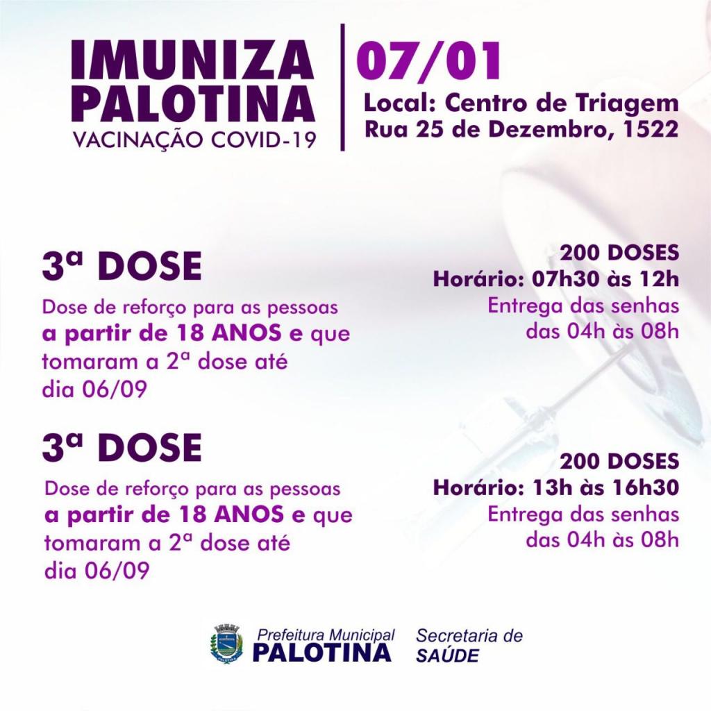 A direção da Secretaria Municipal de Saúde de Palotina informa que nesta sexta-feira (7/1), a equipe de vacinação vai continuar aplicando somente a dose de reforço (3ª dose), da vacina contra a covid-19 nas pessoas que receberam a segunda dose até o dia 06/09.
