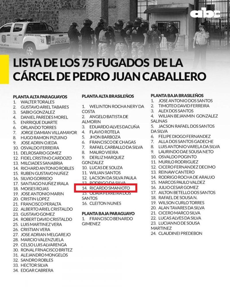 Uma lista de foragidos brasileiros e paraguaios foi divulgada pelo Ministério da Justiça. Entre eles, estão o brasileiro Timóteo Ferreira, apontado como líder da facção dentro do presídio, e seis supostos integrantes do grupo de matadores de aluguel ligados ao tráfico "Minotauro". Eles atuam na fronteira e na semana passada buscavam deixar a prisão com uma ordem judicial.