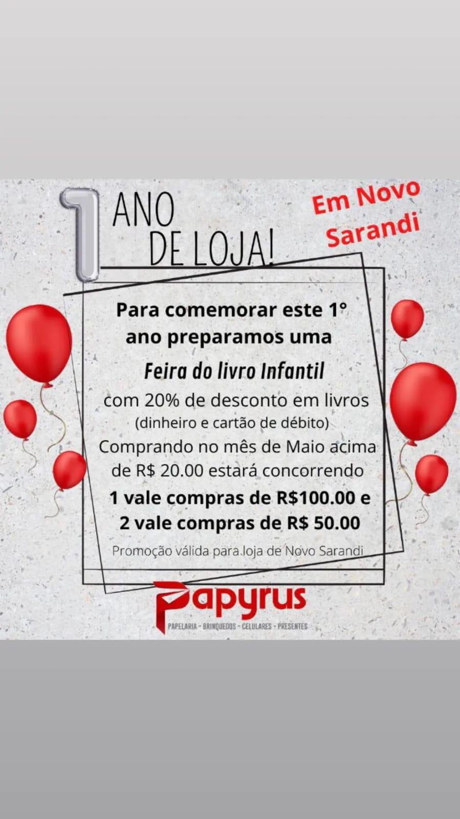 Para comemorar o 1º ano da Papyrus Papelaria de Novo Sarandi, a loja preparou um presentão pra você amigo cliente, é a Feira do Livro Infantil, 20% de desconto, para pagamento no cartão de débito ou no dinheiro.