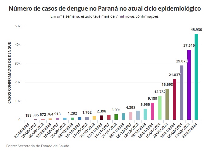 No total, segundo a secretaria, são 45.930 casos confirmados e 16 mortes desde o início do período epidemiológico, em julho de 2023. Veja o avanço das confirmações: