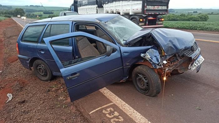 O Volkswagen Parati trafegava na tarde desta quinta-feira na rodovia PR 317 no sentido a Toledo e nas proximidades do campo de golfe do Olinda Park Hotel colidiu em um caminhão que estava parado.