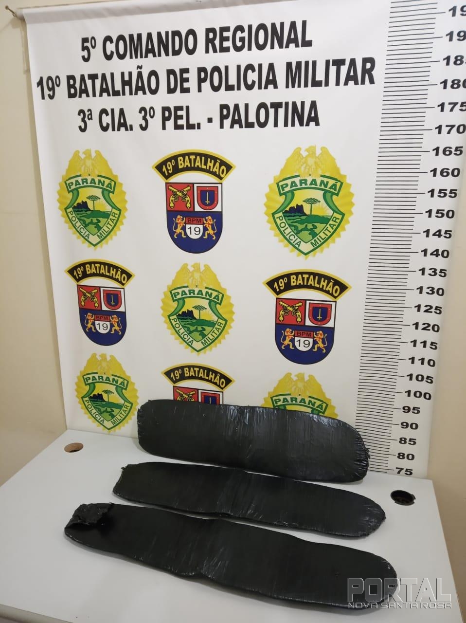 Em buscas no corpo da mulher foram localizados três invólucros contendo Haxixe que após pesagem totalizaram 7,150 kg (sete quilos e cento e cinquenta gramas).