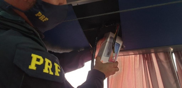 Dando continuidade a fiscalização ao veículo foram encontrados, ainda, alguns indícios que levaram a uma fiscalização minuciosa no duto de ar-condicionado, onde foram localizados vários celulares de origem estrangeira, não sendo identificado o responsável pelos mesmos.