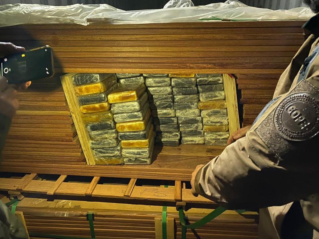 A droga foi encontrada em meio a carga de paletes, carregada em caminhões.