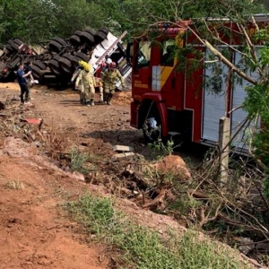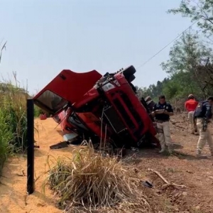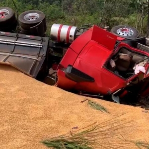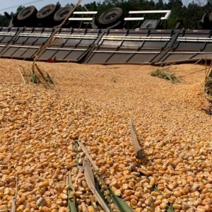 Um pedestre, de aproximadamente 50 anos, foi soterrado por milho após uma carreta tombar na BR 163, em Cascavel, na tarde desta quarta-feira (25).