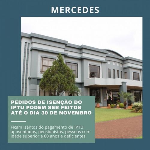 Conforme a lei complementar 010/2008 do código tributário municipal de Mercedes, ficam isentos do pagamento de IPTU no município aposentados, pensionistas, pessoas com idade superior a 60 anos e deficientes.