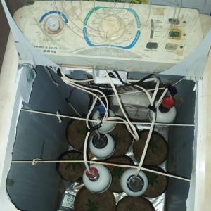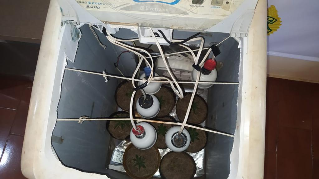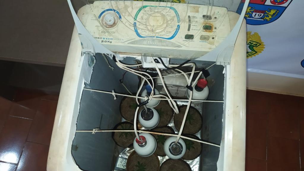 Indagado se na casa de havia mais ilícitos um dos rapazes disse que sim, na sequência, a equipe deslocou até a casa loca lizada no bairro Pérola e foi encontrado mais vinte e nove gramas de maconha, cinco gramas de sementes de cannabis sativa, também foi encontrado no quarto uma estufa improvisada em uma máquina de lavar com oito pés de maconha no seu interior.