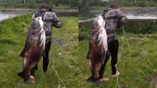 O peixe gigante pertence à espécie "carpa-cabeçuda", conhecida por apresentar manchas negras dispersas pelo corpo. No vídeo, o pescador aparece carregando a carpa com a ajuda de uma corda. Mesmo com a maior parte do corpo suspensa, a cauda do peixe ainda toca o chão.