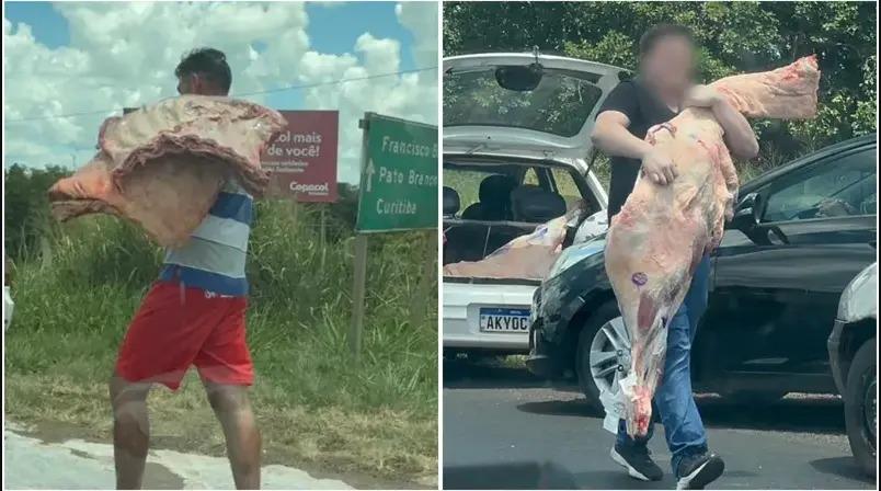 Em um dos vídeos, dezenas de pessoas aparecem pegando pedaços de carne pela parte traseira do veículo. Algumas também são vistas guardando o produto saqueado em carros estacionados às margens da PR-281, enquanto outras sorriem e "abraçam" pedaços maiores de carne.