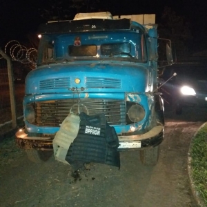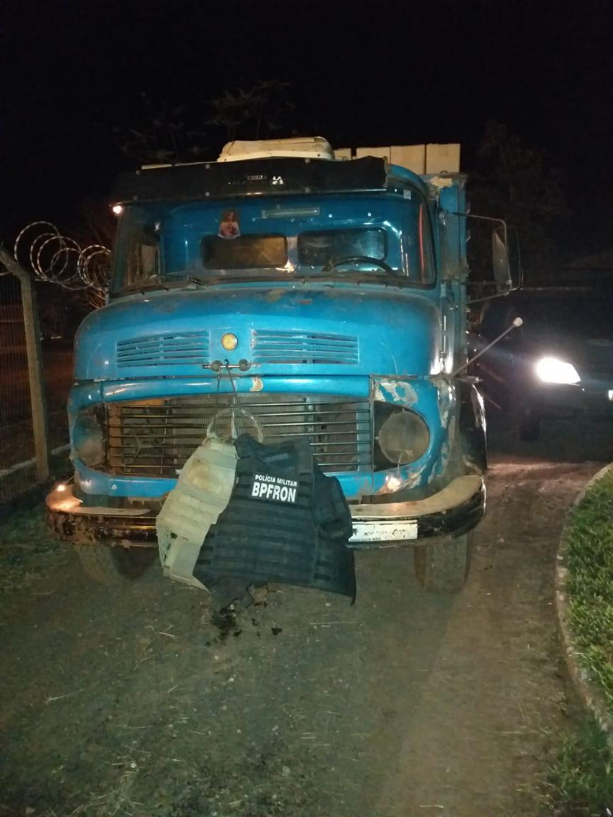 No local, foi apreendido um caminhão Mercedes Benz 1113 totalmente carregado com aproximadamente 500 caixas de cigarros paraguaios.