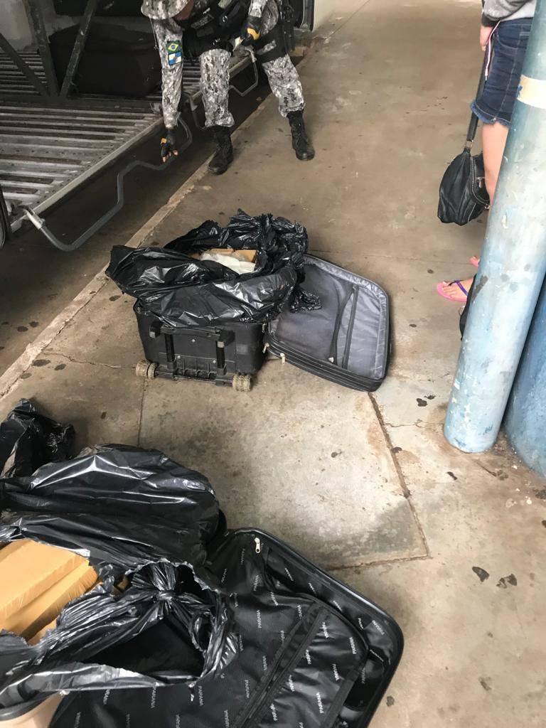 Em certo momento, o cão farejador indicou odor suspeito em duas malas que estavam prontas para serem colocadas no bagageiro de um ônibus com destino a Porto Alegre/RS, e ali foram encontrados vários tabletes de maconha que, após pesados, somaram 48,5 kg.