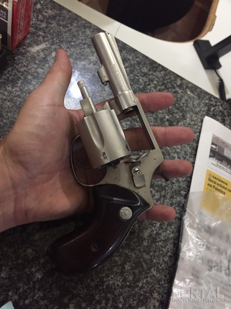 Perguntado sobre a possível arma, indicou que havia deixado ela dentro da casa para a qual correu, sendo esta apreendida em cima de uma estante na sala de estar, foi apreendido um revólver calibre 38 de marca Taurus (nº série CJ 61742).