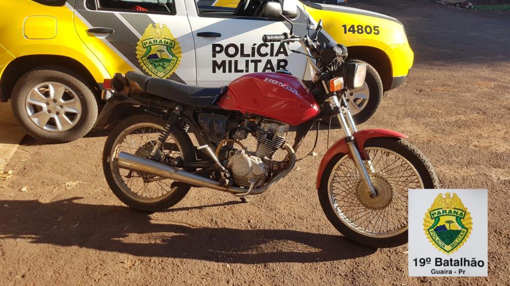 Neste sábado (12) em patrulhamento pela estrada Roland, próximo ao antigo Club 27 em Guaíra, a equipe de serviço da Polícia Militar avistou uma motocicleta de cor vermelha, a qual não ostentava placa, sendo ocupada por duas pessoas, motorista e passageiro.