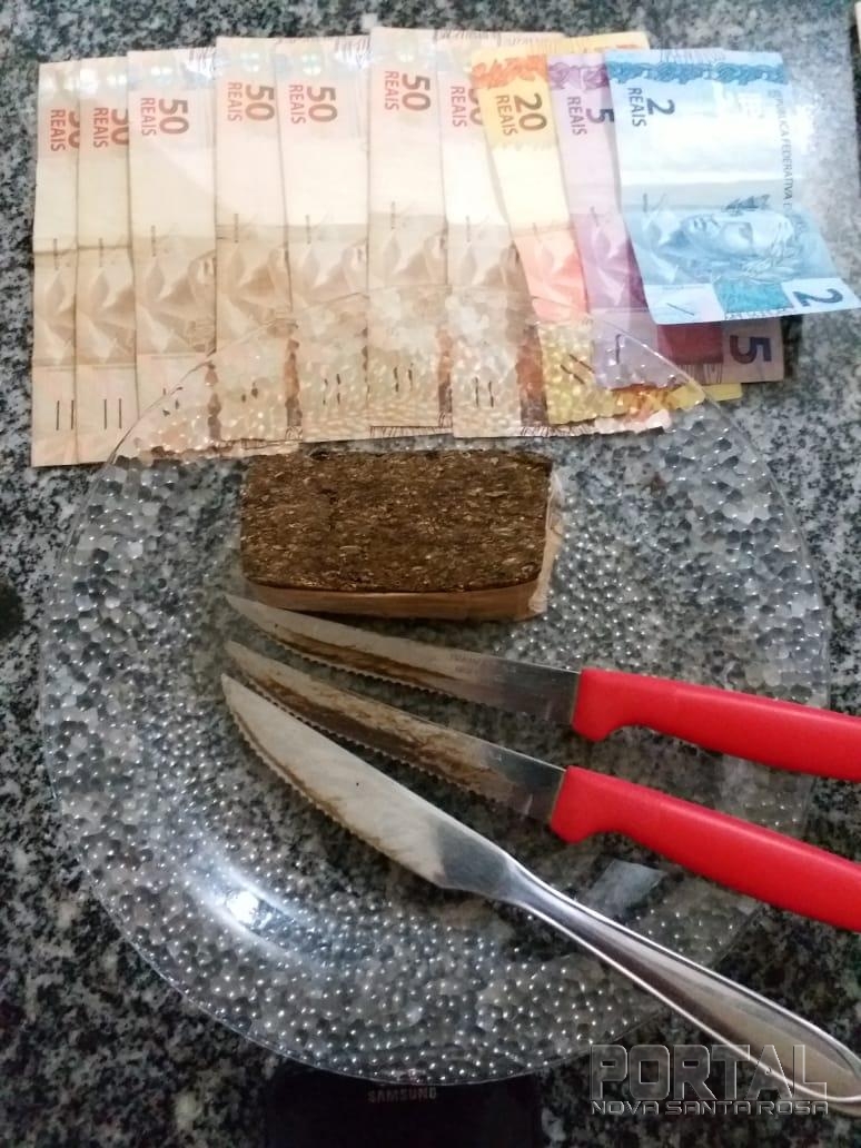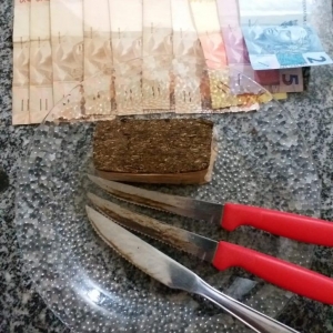 Os militares foram até o posto de combustíveis e abordaram o condutor do caminhão Volvo,modelo VM 270, em buscas na cabine, foi localizado dentro de uma mochila um tablete de maconha, pesando 91 gramas e um prato com três facas com resquícios da substância.
