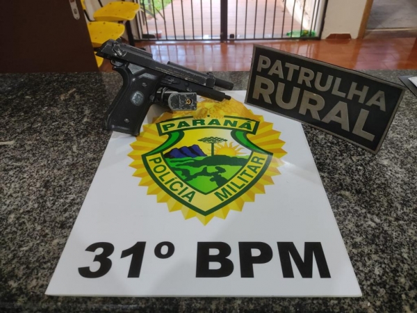 A PM chegou na casa onde estava o acusado e após ser indagado, colaborou com a entrada na polícia na residência e foi localizado em um dos cômodos uma réplica de arma de fogo, marca Beretta modelo M92FS cal.6m, Air Soft, de cor preta.