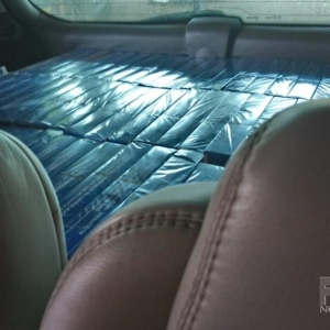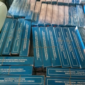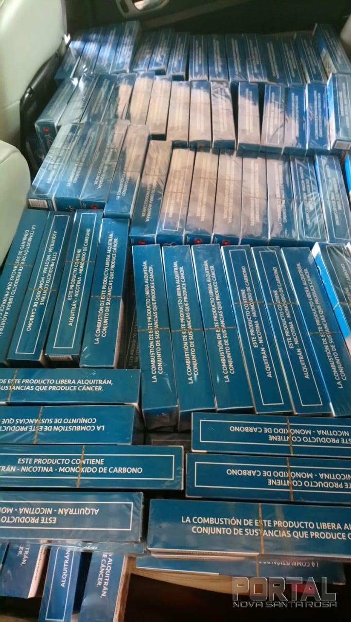Dentro do veículo foi encontrado certa quantidade de pacotes de cigarros carregado até próximo à altura dos vidros, e sem notas de procedência.