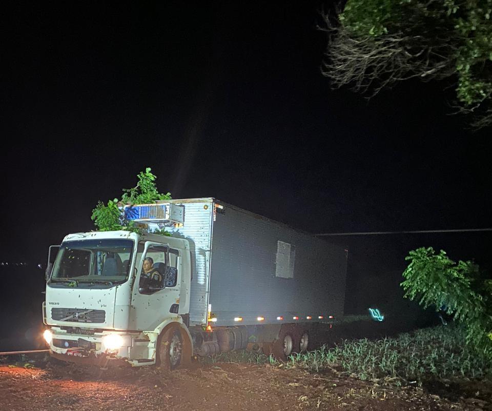 No local os policiais militares encontraram um caminhão Volvo/vm 260 6x2r com placas de Arapongas, mas sem registro de furto.