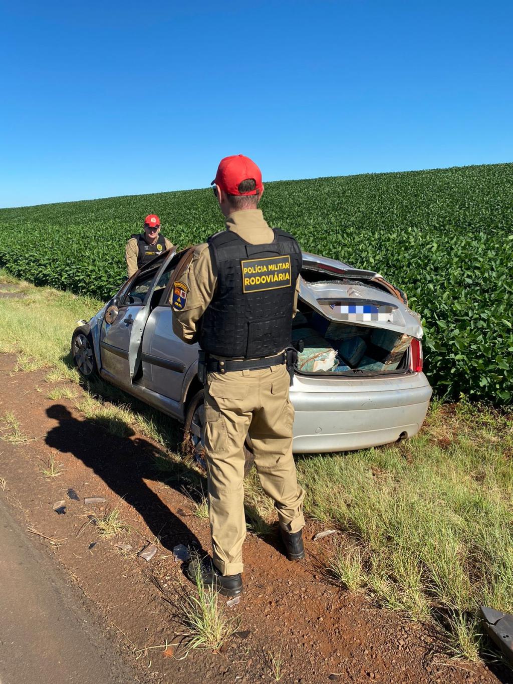 No local do acidente, os policiais encontraram diversos fardos de maconha espalhados pela pista e outros no porta-malas do carro, totalizando 184,5 kg. Durante a inspeção, foi constatado que o Citroën C3 ostentava placas falsas, sendo identificado como um veículo furtado em Guaíra em setembro deste ano.