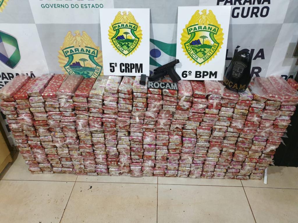 Em meio as caixas os policiais localizaram uma grande quantidade de tabletes de maconha e também uma arma de fogo que estava com a numeração suprimida.