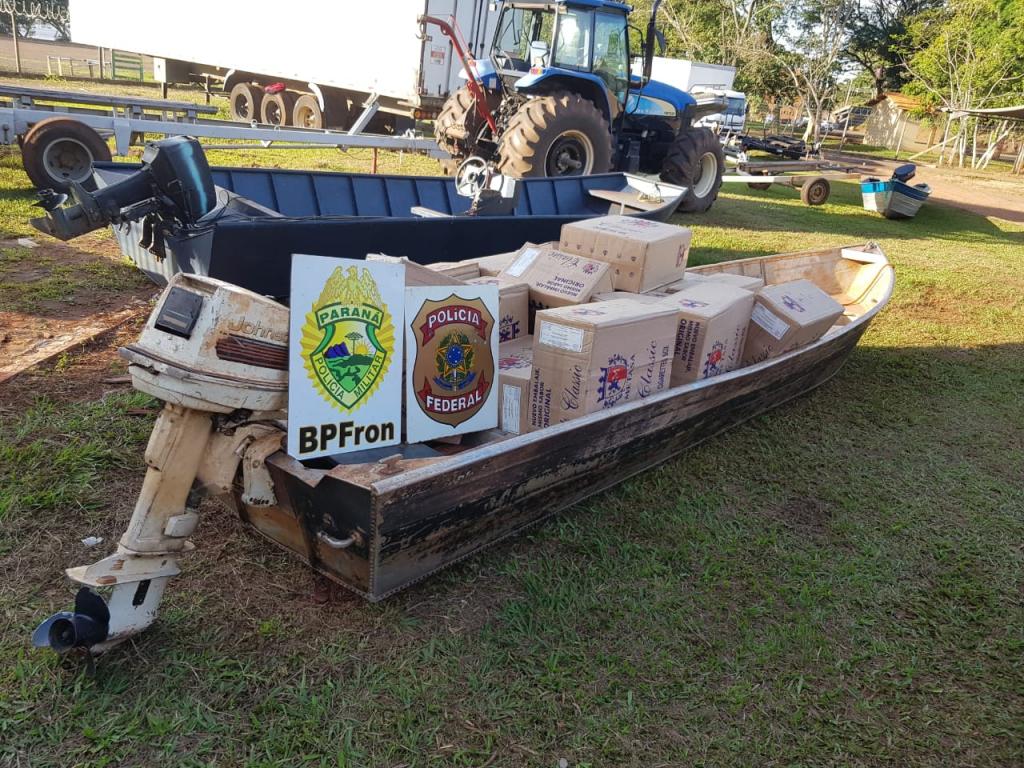 No local, foram apreendidos uma embarcação e diversos volumes de cigarros paraguaios.