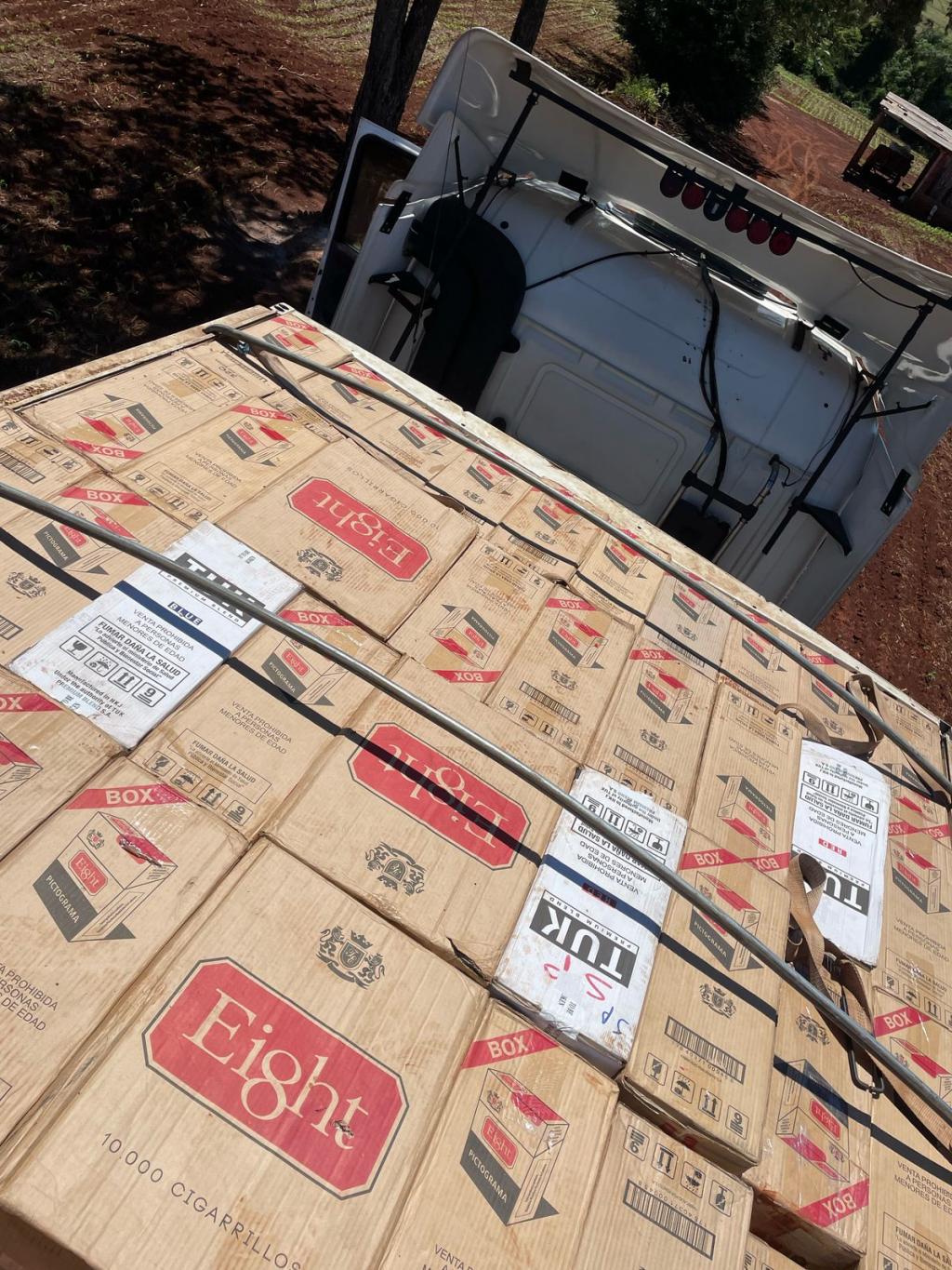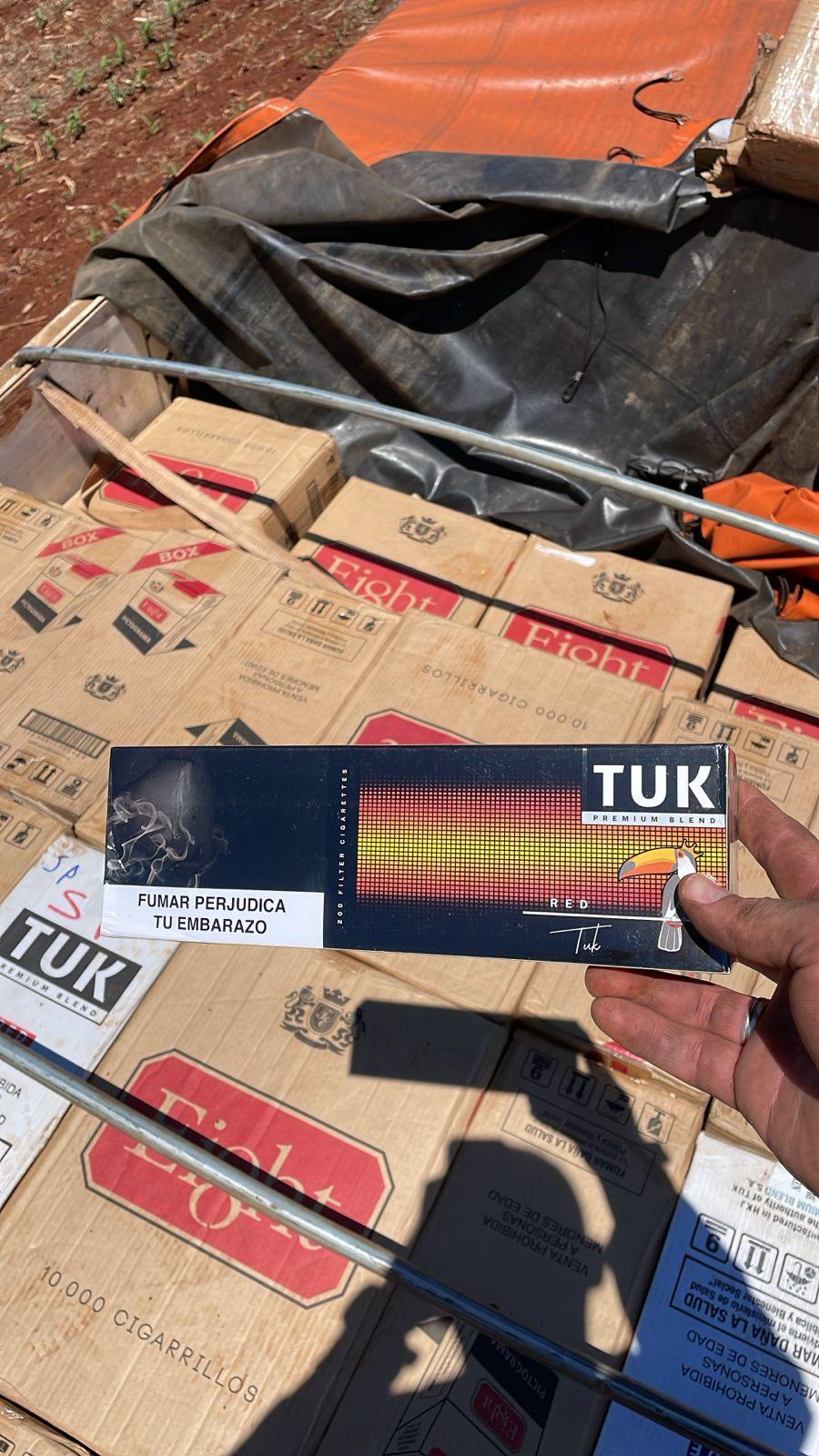 Ao inspecionar a lona, os agentes notaram um corte, permitindo visualizar a carga ilícita. Além dos cigarros, também foram encontrados produtos eletrônicos variados. Um espaço vazio na carga indicava que parte dos volumes pode ter sido transferida para outro veículo antes da abordagem.