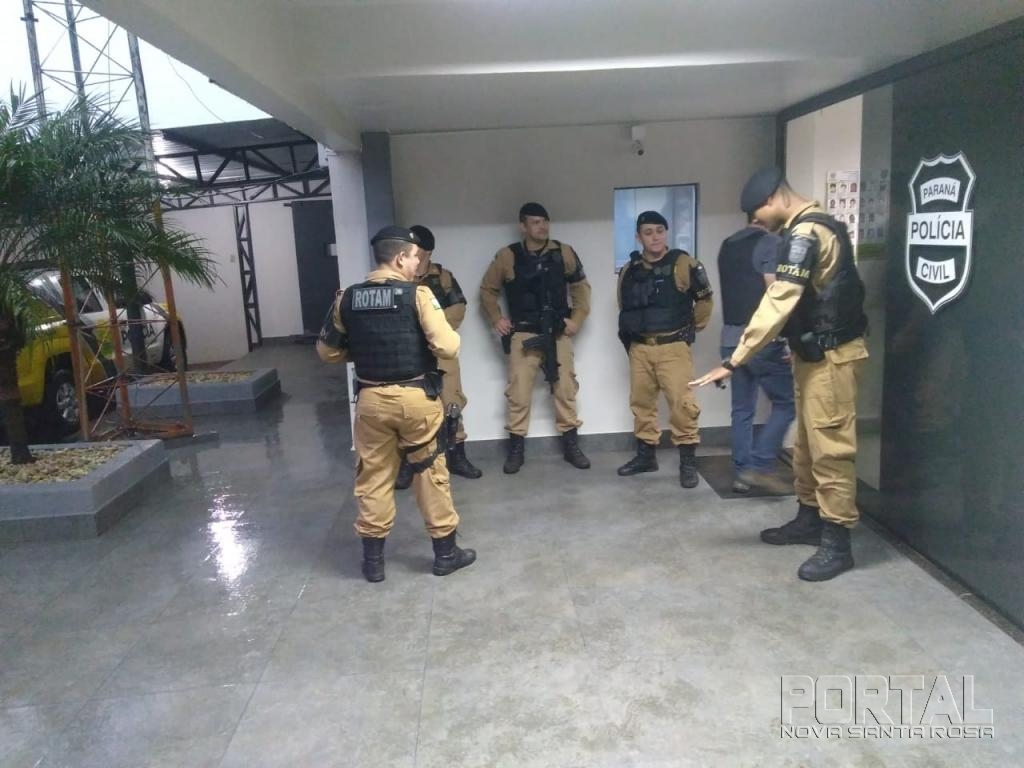 Policiais civis de Cascavel prestam apoio nos cumprimentos de mandados. As equipes seguem nas ruas em busca dos demais envolvidos.