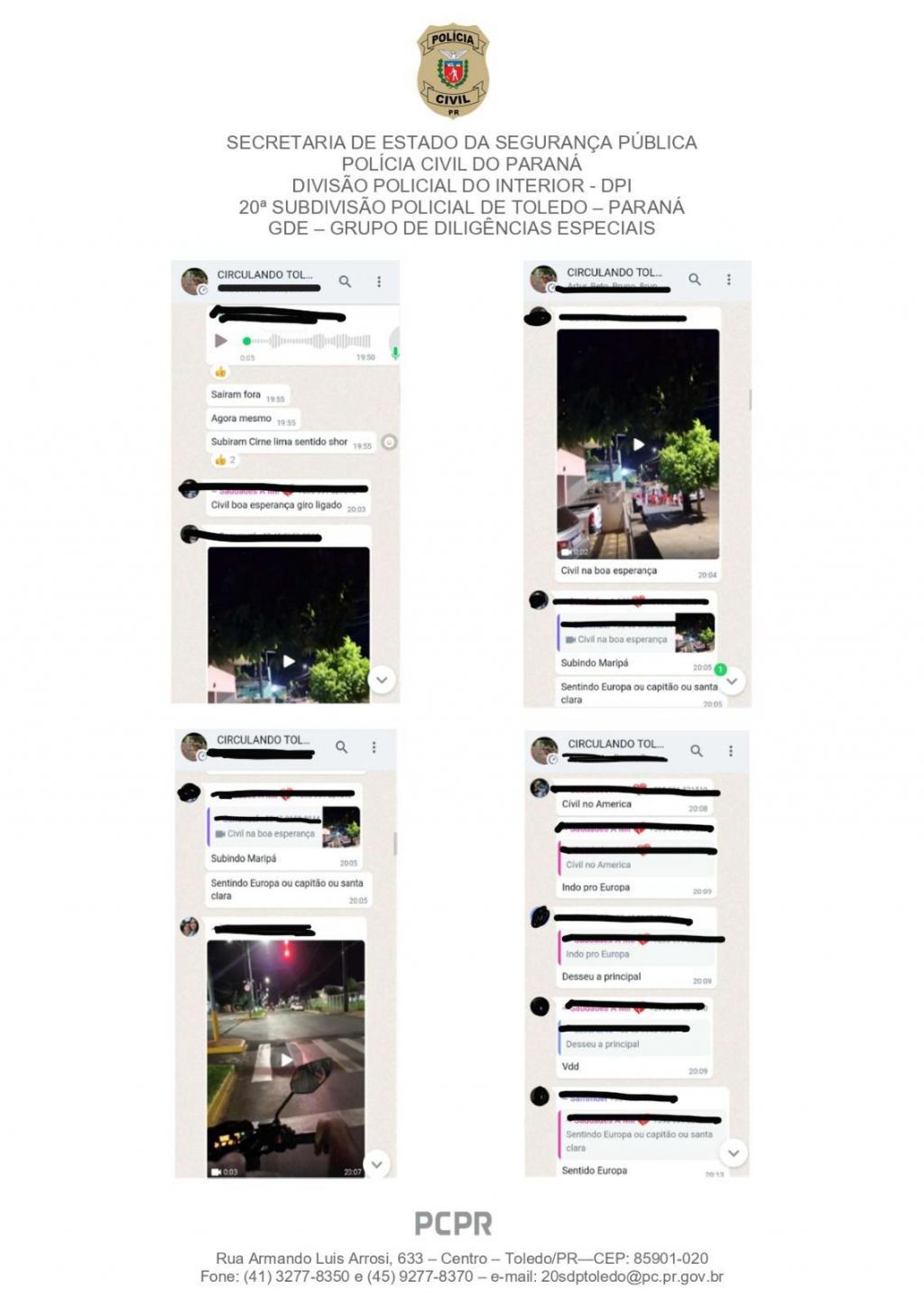 Os alvos são apontados como administradores de grupos em aplicativo de mensagens que tinham como finalidade o monitoramento da rotina das forças de segurança pública, em especial da Polícia Civil e da Polícia Militar, no município de Toledo. O grupo, com mais de 600 integrantes, era utilizado para compartilhar em tempo real informações sobre ações policiais, muitas vezes frustrando diligências, operações e prejudicando serviços de interesse público.