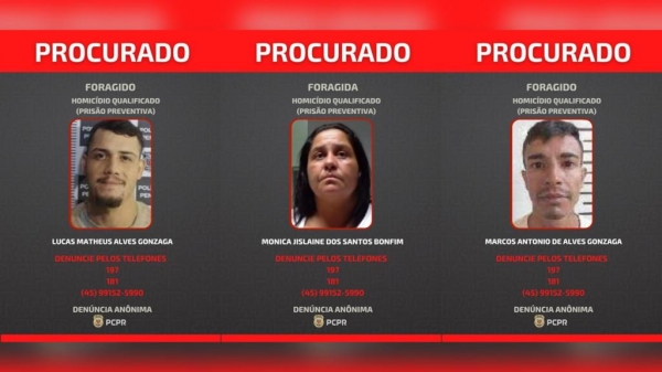Segundo o delegado Leandro Stabile, os foragidos — Lucas Matheus Alves Gonzaga, Monica Jislaine dos Santos Bonfim e Marcos Antonio de Alves Gonzaga — agiram com um quarto envolvido que já está preso preventivamente. Eles são apontados como autores da morte de um homem de 32 anos, que foi brutalmente assassinado com golpes de pedra na cabeça.