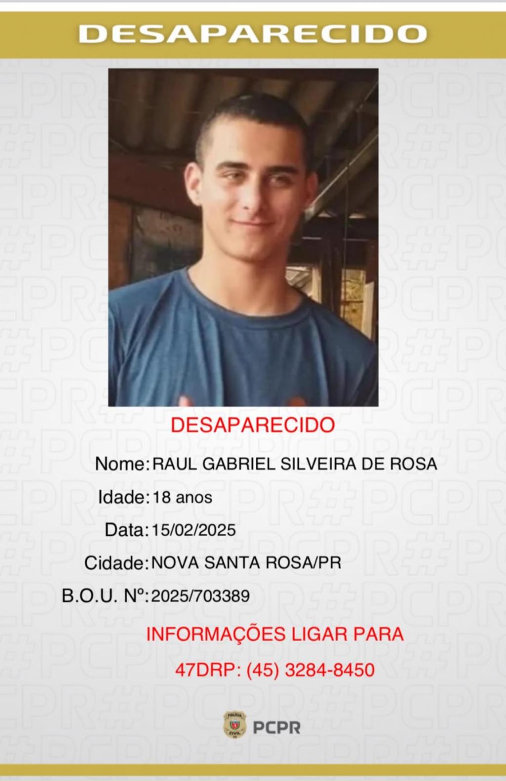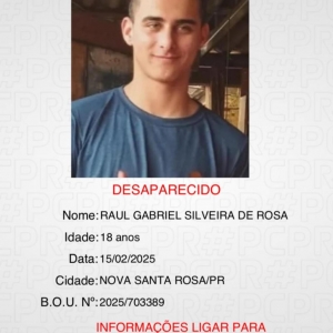 Qualquer informação que possa contribuir para a localização de Raul Gabriel Silveira da Rosa pode ser repassada pelos números (45) 9 9921 8576 ou (45) 9 9977 5265.