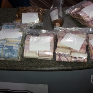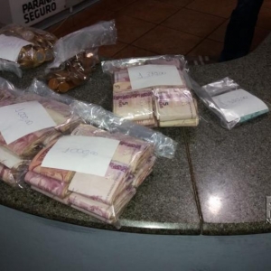 O dinheiro foi contato, totalizando 8.252 reais e 25 buchas de cocaína e de crack, embaladas já para venda.