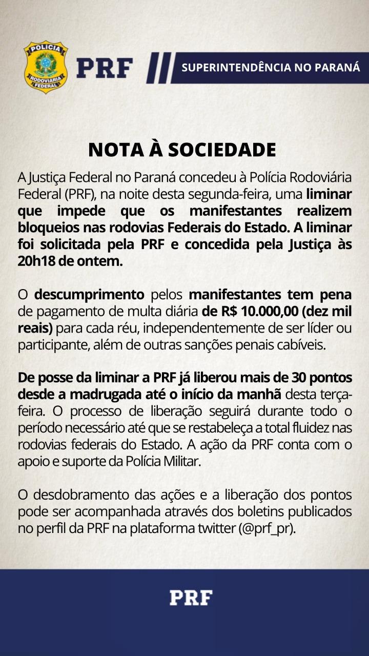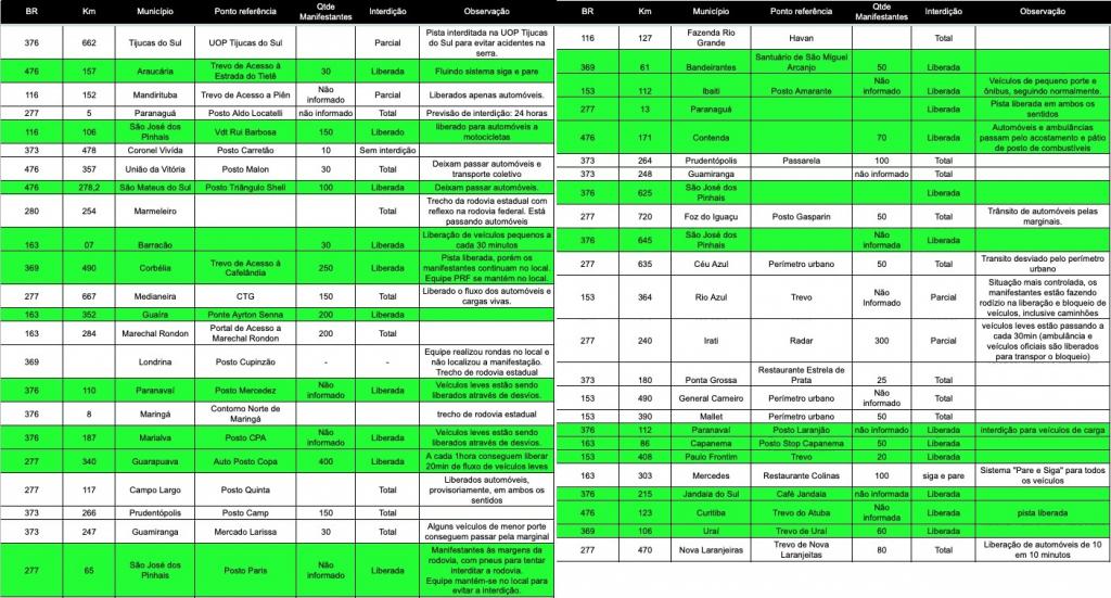 PRF (Polícia Rodoviária Federal), Polícia Militar e BPFron (Batalhão de Polícia da Fronteira) começaram a desbloquear as estradas no oeste do Paraná.