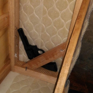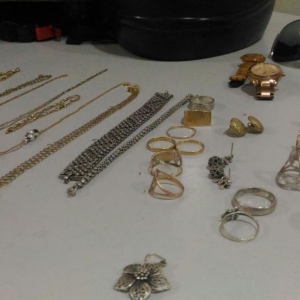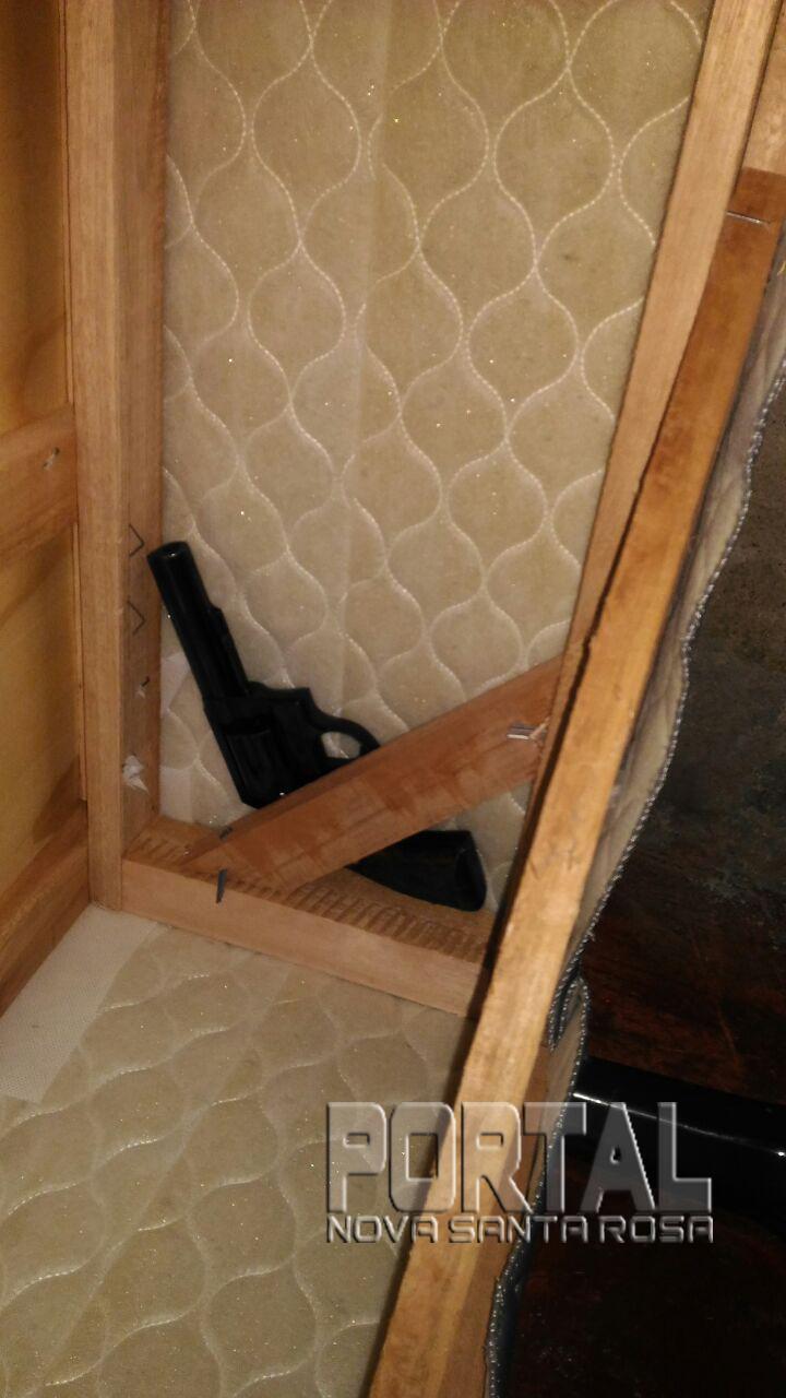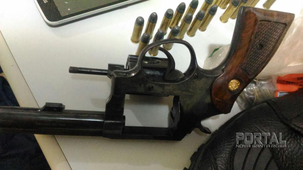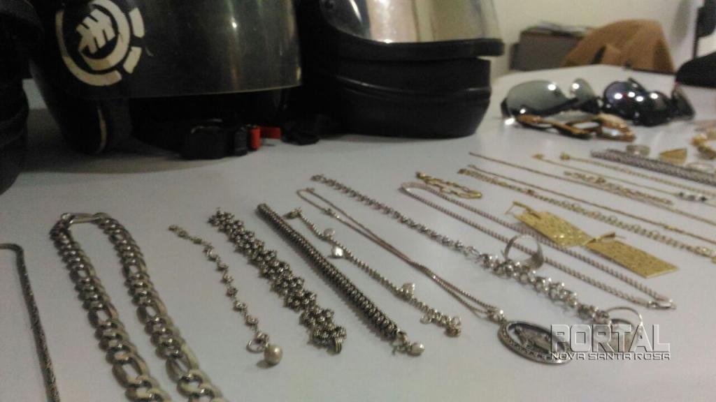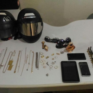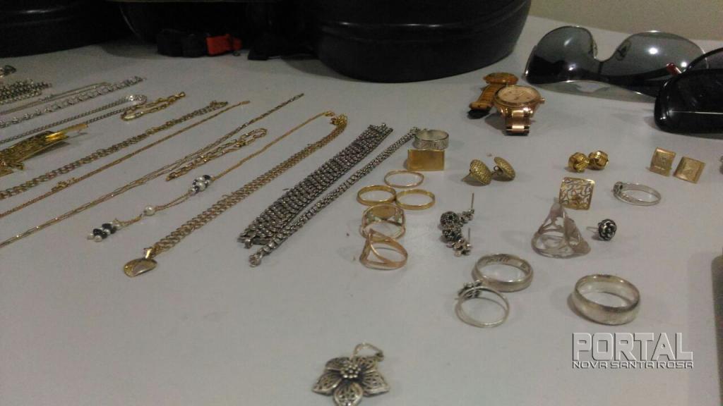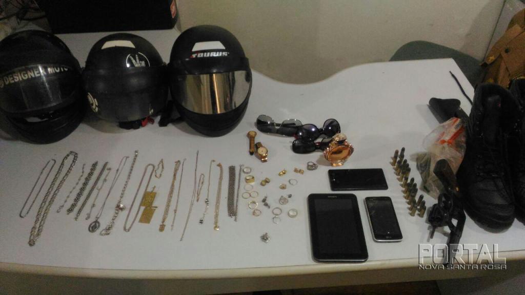 A prisão aconteceu após um patrulhamento na rua Carlos Gomes, residência de Marcos que possuía mandado de prisão em aberto, foi avistado um suspeito fugindo do interior da casa e foi efetuada a abordagem do elemento na residência, no seu quarto foi localizado um revólver calibre 38 Taurus (jd300220) municiado com 06 cartuchos, e 16 munições, também foram encontradas diversas joias de ouro, prata e semi joias (reconhecidas como subtraídas de roubos recentes), aparelhos celulares Sony e LG e um Tablet Samsung, entre outros objetos.
