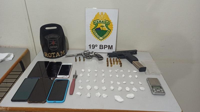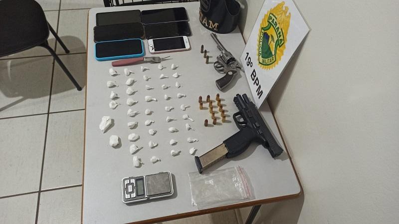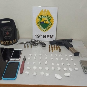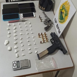Durante patrulhamento, o veículo Chevrolet Cruze, utilizado pelos suspeitos, foi localizado na Avenida Maripá. Ao tentarem abordar os ocupantes, ambos correram para o interior de uma residência, onde foram detidos. No local, os policiais encontraram um revólver calibre .32, uma pistola 9mm com numeração suprimida e 69 gramas de cocaína fracionadas para venda, além de uma balança de precisão e seis celulares.
