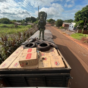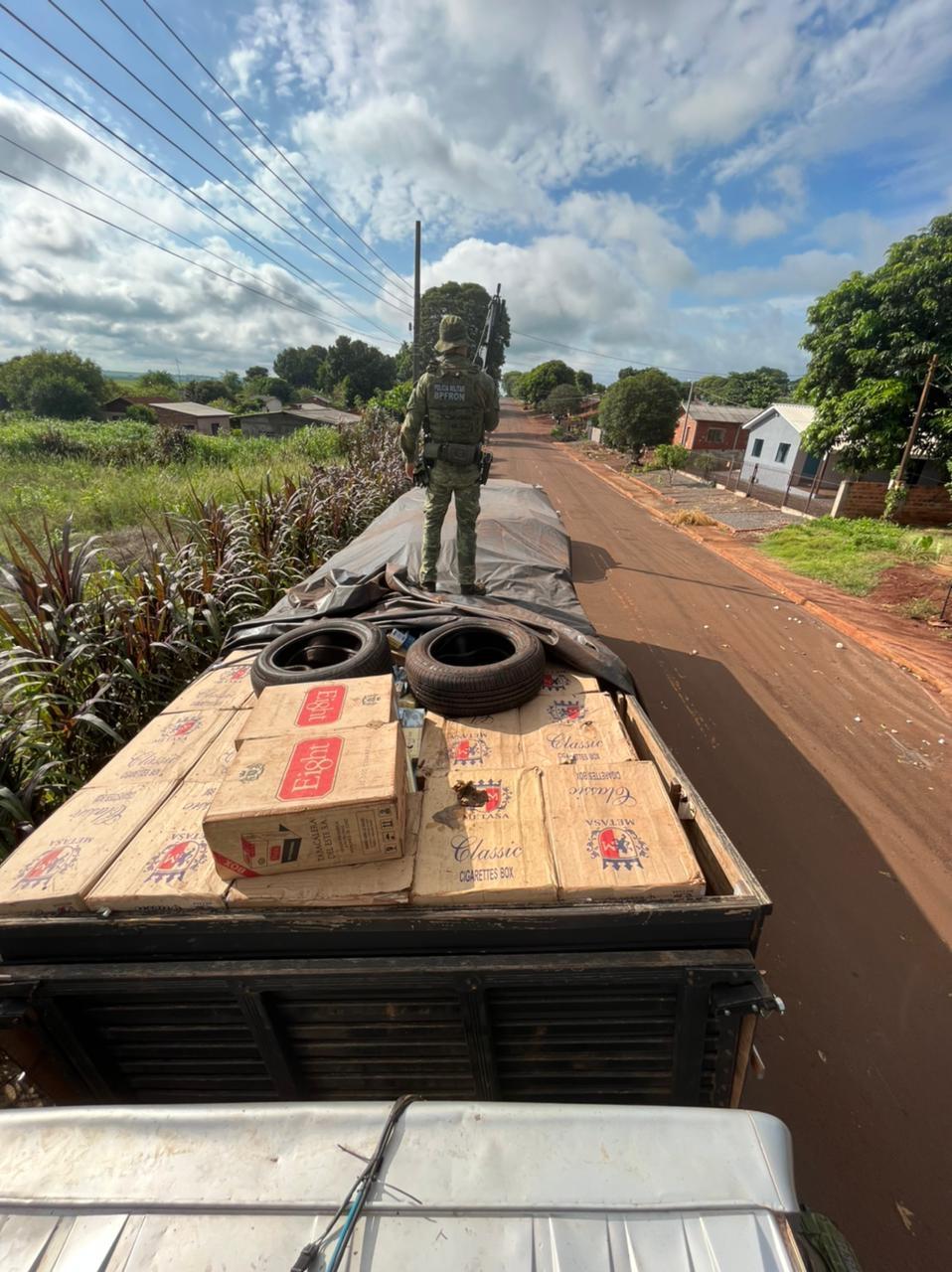Na quinta-feira (12), policiais militares do BPFRON - Batalhão de Polícia de Fronteira em ação integrada com a Polícia Federal, realizavam patrulhamento em Palotina, durante Operação Hórus, quando avistaram um caminhão abandonado carregado com cerca de 20.000 pacotes de cigarros e 10 pneus contrabandeados.