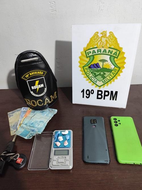 Durante a revista, os policiais encontraram com um dos passageiros cinco buchas de cocaína dentro do tênis e mais uma dentro de uma meia, totalizando 2,8 gramas da substância. No interior do veículo, foram apreendidos R$ 224 em dinheiro e dois celulares.