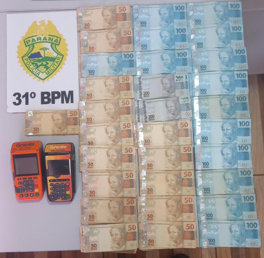 Durante a abordagem, foram identificadas quatro pessoas no carro. Em revista pessoal, os policiais encontraram R$ 30.500,00 em dinheiro na bolsa de uma passageira, além de duas máquinas de cartão da marca Granito. Segundo a mulher, ela e o marido trabalham como vendedores autônomos de panelas e costumam realizar transações em dinheiro.