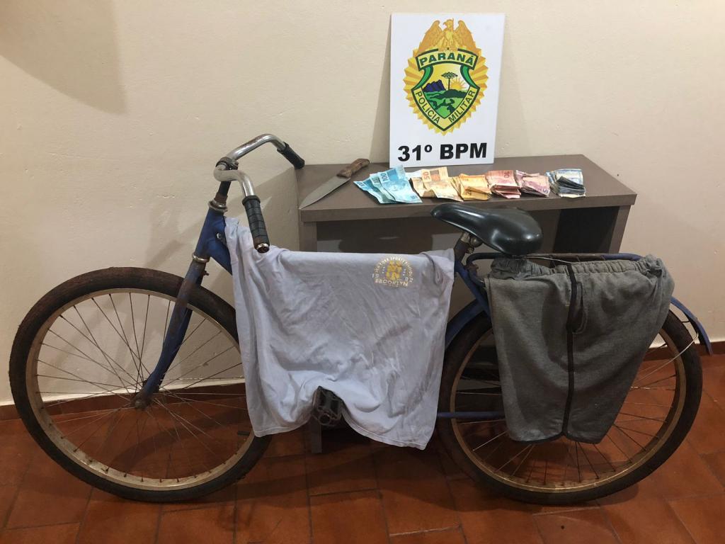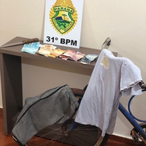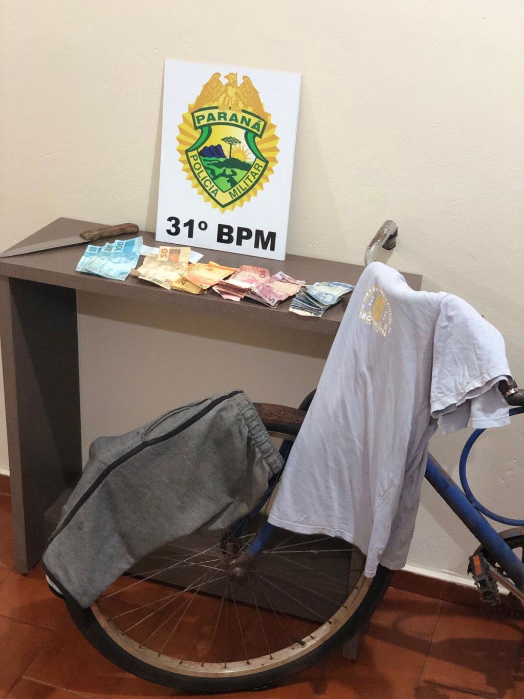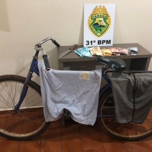 Na residência do homem foi localizada a roupa e a bicicleta usada na ação, bem como cerca de R$ 1.000,00 levados da farmácia.