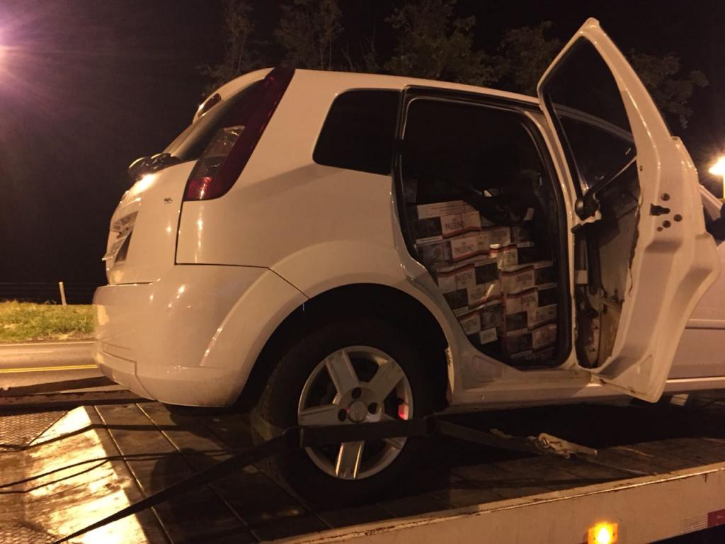 Após vistoriar o veículo, foram localizados, em seu interior e porta malas, aproximadamente seis mil maços de cigarros das marcas Eight e Palermo, oriundos do Paraguai.