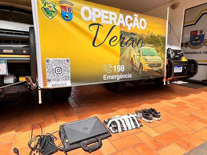 O furto ocorreu em uma empresa da cidade, de onde foram levados três notebooks, um par de tênis e dinheiro. Com base nas imagens das câmeras de segurança, que ajudaram a identificar as características dos autores, a equipe realizou patrulhamento pela PR-488.