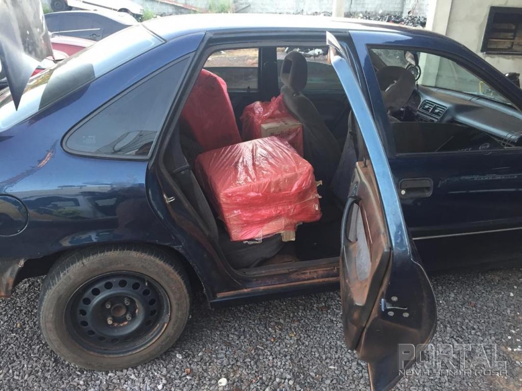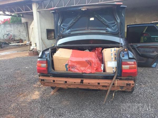 Durante a abordagem, foi perguntado a passageira do veículo qual material estaria no veículo e a mesma afirmou que teriam oito caixas de cigarro, de variadas marcas, todas oriundas do Paraguai.