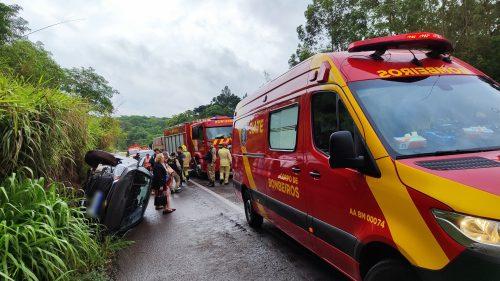 A batida envolveu um Ford Focus e um Chevrolet Onix. Após o impacto, o Onix capotou na rodovia e parou tombado.
