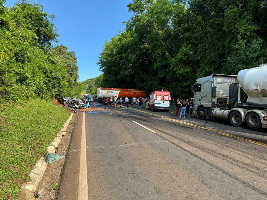 O carro do PM foi lançado para um barranco, e o segundo carro, que trafegava no sentido Cascavel, também bateu no caminhão, que ficou no meio da rodovia, bloqueando o tráfego.